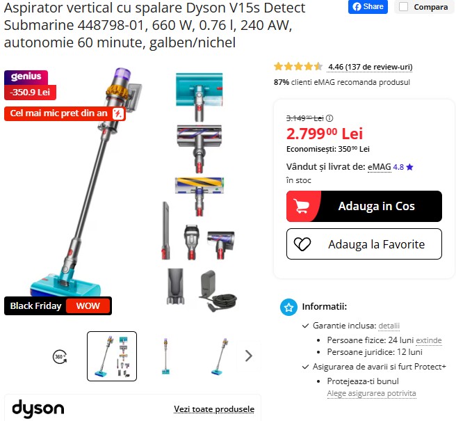 Aspiratorul vertical cu spălare Dyson V15s Detect Submarine este acum 2.799,00 lei pe eMAG, redus cu 350,90 lei față de prețul anterior de 3.149,90 lei – cel mai mic preț din an, valabil de Black Friday. Oferă aspirare puternică de 240 AW, funcție de spălare umedă, iluminare laser pentru praf, autonomie de până la 60 minute și include 6 accesorii. Ideal pentru părul de animale, covoare și pardoseli dure. Stoc limitat! 🌀🧽⚡