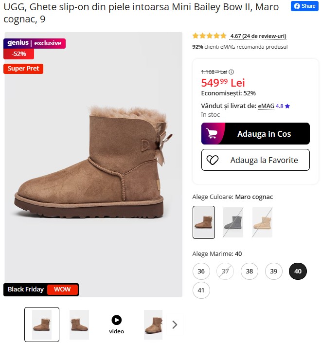 Ghetele UGG Mini Bailey Bow II din piele întoarsă, culoare maro cognac, mărimea 40 (9 US), sunt disponibile pe eMAG la prețul promoțional de 549,99 lei, redus de la 1.168,29 lei – o reducere de 52% valabilă de Black Friday. Acestea sunt slip-on, căptușite cu lână, cu talpă joasă și design casual. Sunt apreciate pentru confort și stil, fiind recomandate de 92% dintre clienți. Stoc limitat! 👢❄️🔥