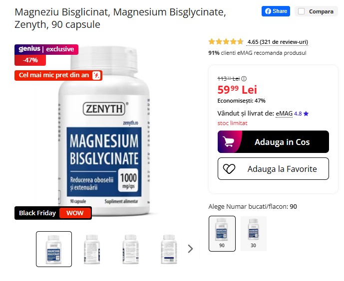 Suplimentul Magneziu Bisglicinat de la Zenyth, 90 capsule, este acum disponibil pe eMAG la 59,99 lei, redus de la 113,21 lei – cea mai mare reducere din an (47%), valabilă de Black Friday. Conține o formă bine tolerată și ușor absorbită de magneziu (bisglicinat), recomandată pentru susținerea somnului, relaxării și sănătății sistemului nervos. Nu are efect laxativ. Stoc limitat! 💊🧠😴