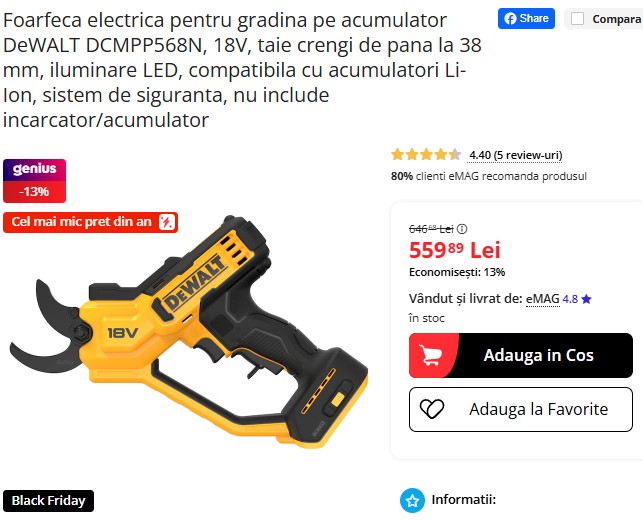 Foarfeca electrică pentru grădină DeWALT DCMPP568N este acum 559,89 lei pe eMAG, redusă de la 646,68 lei – cel mai mic preț din an, valabil de Black Friday. Funcționează cu acumulatori Li-Ion 18V (nu sunt incluși), taie crengi de până la 38 mm, are lamă acoperită antiaderent, iluminare LED și sistem de siguranță dublu. Ideală pentru tăieri precise și rapide în grădină. Stoc limitat! 🌳✂️🔋