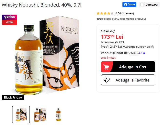 Whisky-ul Nobushi Blended (40%, 0.7L) este acum disponibil pe eMAG la 173,99 lei, redus de la 218,20 lei – o economie de 20% valabilă de Black Friday. Maturat 4 ani în butoaie de stejar american, oferă un profil aromatic cu note florale, fructate, condimente, vanilie și caramel. Produs japonez, cu design elegant și gust echilibrat. Stoc limitat! 🥃🌸🇯🇵
