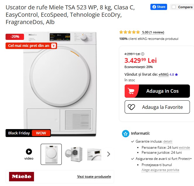 Uscătorul de rufe Miele TSA 523 WP, cu capacitate de 8 kg și tehnologie EcoDry, este disponibil acum pe eMAG la 3.429,99 lei, redus de la 4.299,91 lei – cel mai mic preț din an, valabil de Black Friday. Oferă funcții avansate precum EcoSpeed, FragranceDos, motor ProfiEco, AddLoad și program de pre-calcare cu abur. Calitate germană, eficiență, grijă pentru haine și economie de energie. Stoc limitat! 👕🌀🇩🇪