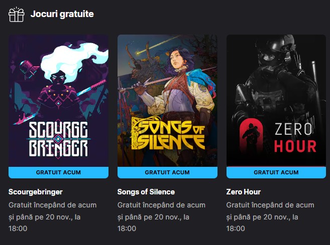 Epic Games intră devreme în spiritul reducerilor de toamnă, iar săptămâna asta vine cu o combinație solidă de titluri gratuite și promoții care taie prețurile până la -90%. Începând din 13 noiembrie, poți revendica fără cost trei jocuri interesante: ScourgeBringer, Songs of Silence și Zero Hour – toate disponibile gratuit până pe 20 noiembrie, ora 18:00.
