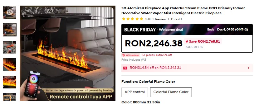 Un șemineu decorativ cu abur colorat, controlat prin aplicație și complet eco-friendly, poate fi acum cumpărat de pe AliExpress la 2246 lei, cu o reducere consistentă de 2765 lei față de prețul original de 5011 lei. Modelul de 800 mm (31.5 inch) creează efecte realiste de flacără cu abur rece, perfect pentru interior, fără foc real sau gaze. Transportul e gratuit, iar oferta expiră pe 4 decembrie. 🔥📱🏠