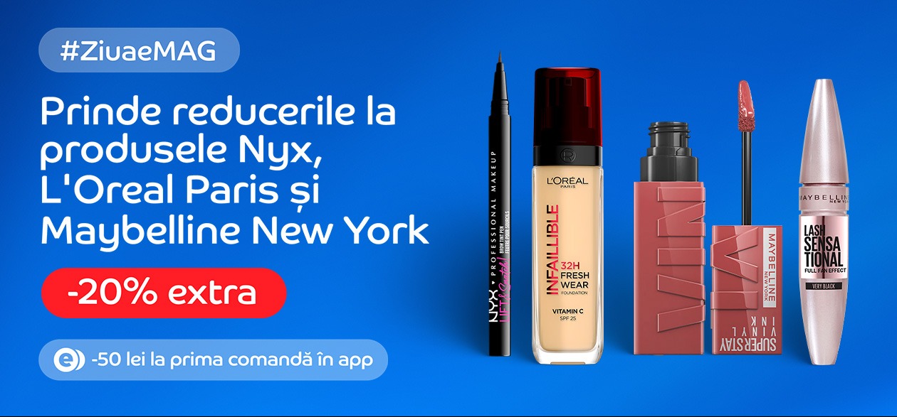 eMAG vine cu o selecție inspirată de produse de makeup perfecte pentru cadourile de sărbători, de la branduri îndrăgite precum L'Oreal Paris, Maybelline New York și NYX Professional Makeup. Fie că alegi un mascara bestseller, un fond de ten cu acoperire impecabilă sau un ruj rezistent, toate pot fi oferite în dar sau folosite pentru un look festiv. În plus, ai 20% extra reducere aplicabilă în coș, la comenzi de minimum 150 lei din campanie, folosind voucherul valabil de Ziua eMAG. Stocurile sunt limitate, așa că profită cât încă mai poți! Toate ofertele sunt aici!💄🎄🎁