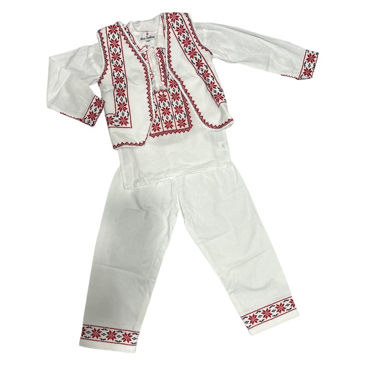 Costumul popular pentru băieți, potrivit pentru 8–9 ani, este disponibil pe eMAG la prețul de 178,99 lei. Setul include 3 piese: ie tradițională, pantaloni și vestă, toate din bumbac de calitate, confortabil și respirabil. Este ideal pentru serbări, Ziua Națională sau alte evenimente speciale. Produs fabricat în România, cu livrare rapidă și posibilitate de ridicare gratuită prin Genius din easybox. 👦🧵🇷🇴