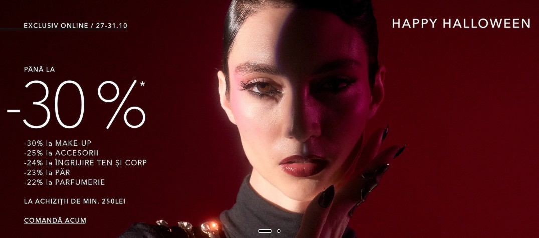 Campania Happy Halloween de la Douglas e în plină desfășurare, cu reduceri care ajung până la -30% exclusiv online, valabile în perioada 27–31 octombrie. Oferta este valabilă doar pentru comenzi de minimum 250 de lei, iar livrarea este gratuită de la 170 de lei în sus. În plus, fiecare comandă vine cu două eșantioane gratuite și ambalare cadou fără costuri suplimentare.