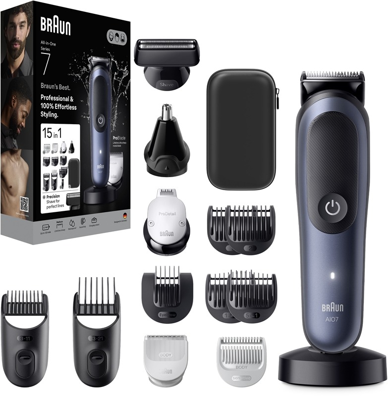 Setul Braun All-In-One Series 7 AIO7580 15 în 1 pentru îngrijirea bărbii, părului și corpului, cu lame ProBlade, tehnologie Autosense și autonomie de 120 minute, are acum o reducere Black Friday pe Notino: de la 641 lei, scade la 385 lei dacă aplici codul NOTINO în coș. Un cadou util și complet, disponibil doar în limita stocului! 🧔💇⚙️