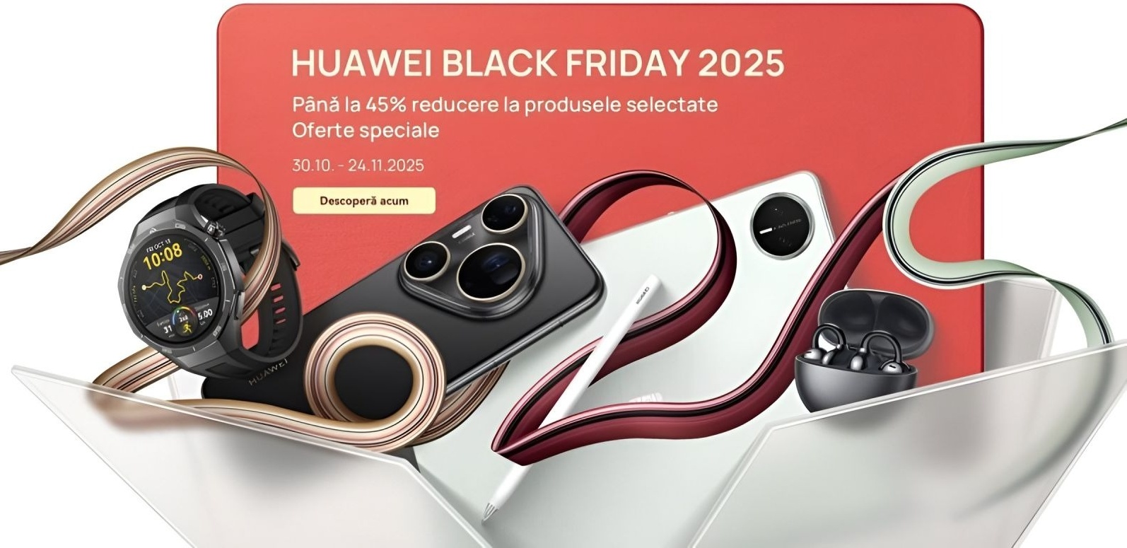 Dacă vrei ceva proaspăt și premium de la Huawei, perioada asta e una dintre cele mai bune pentru a cumpăra. Sunt câteva produse recent lansate, iar prin campania Black Friday au reduceri semnificative, aplicabile cu un cod special. Codul promoțional „A12MOBILISSIMO” îți activează prețurile afișate în imaginile oficiale, iar în cazul unora dintre produse există coduri dedicate, cum e cazul ceasurilor din seria GT5.