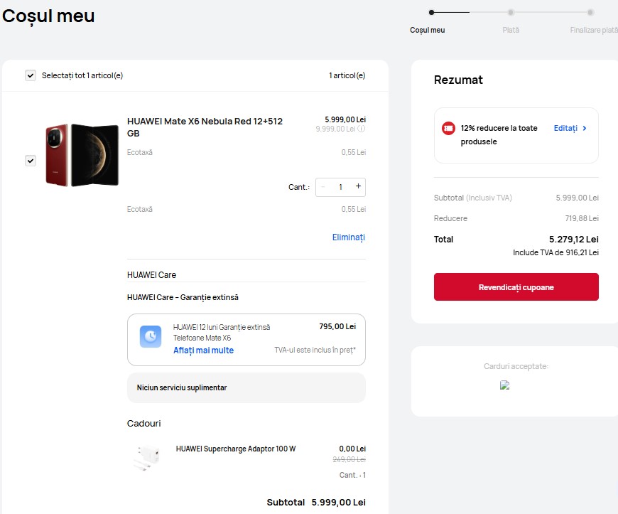 Primul pe listă este HUAWEI Mate X6 Nebula Red, un telefon pliabil spectaculos, cu 12 GB RAM și 512 GB stocare. Prețul lui standard era de 9.999 lei, dar cu reducerea aplicată prin Black Friday și cuponul „A12MOBILISSIMO”, prețul scade la 5.279,12 lei. Aici ai o reducere masivă, de aproape 47%. În plus, în pachet primești cadou adaptorul Huawei Supercharge de 100 W, care separat ar costa 249 lei.
