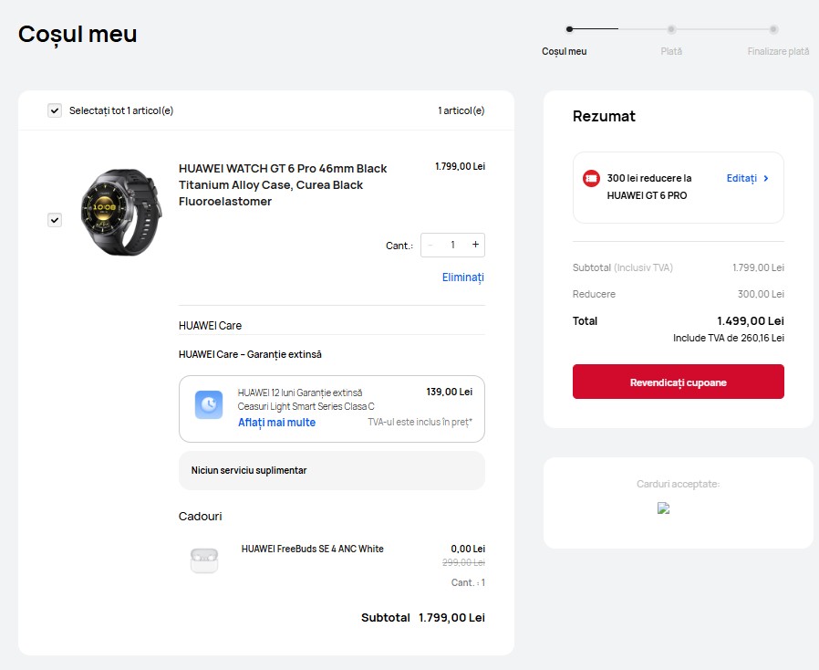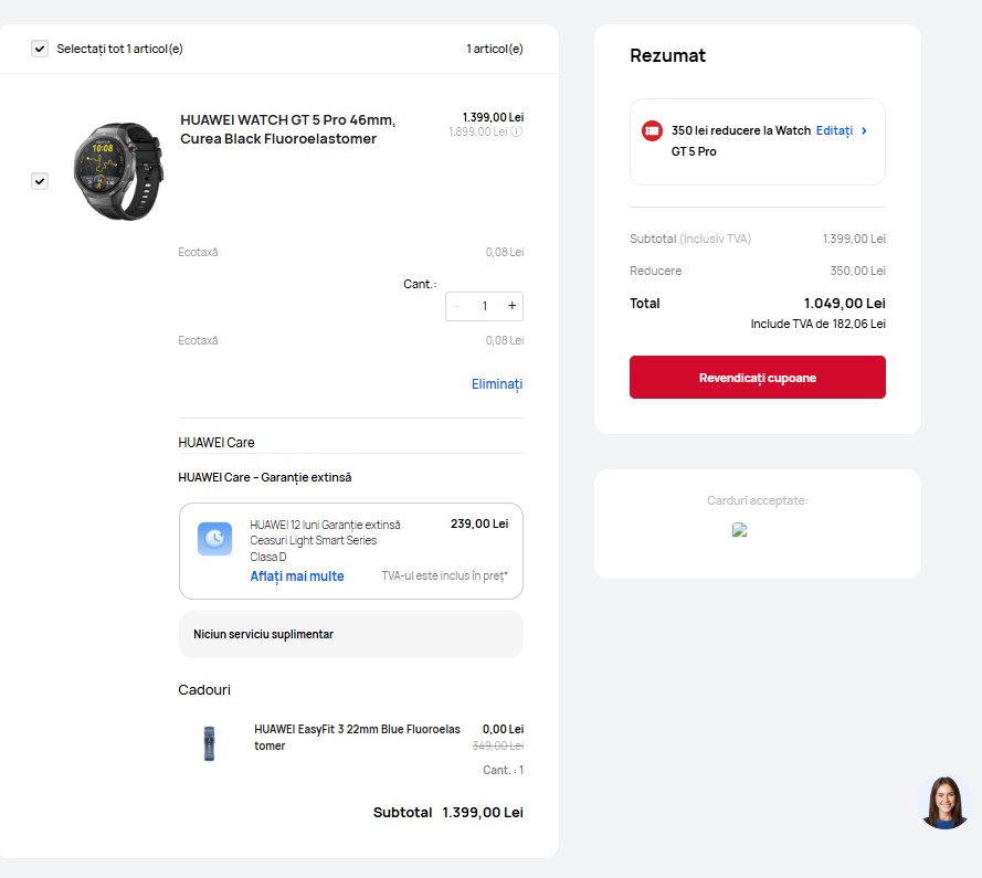 Pentru fanii ceasurilor din seria GT, avem și aici ofertă. Huawei Watch GT 5 Pro 46mm, Curea Black Fluoroelastomer, al cărui preț scade de la 1.899 lei la 1.049 lei, cu un cod diferit: A350GT5PROTD. Reducerea e clară.