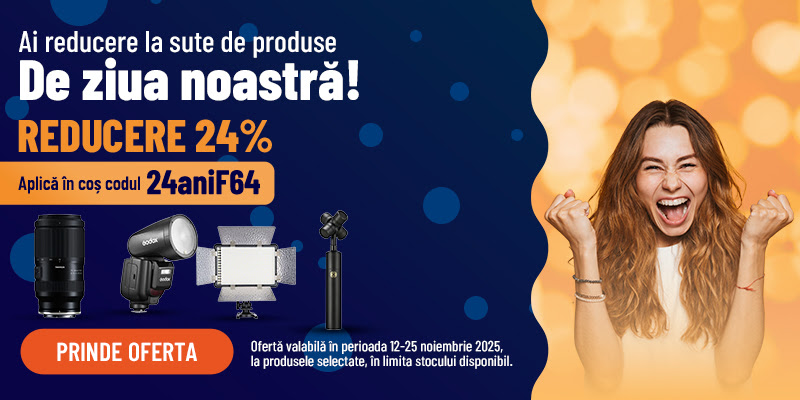 Magazinul F64 celebrează 24 de ani de activitate în domeniul storytelling-ului vizual, iar între 12 și 25 noiembrie vine cu o promoție aniversară aplicabilă pe sute de produse. Reducerea este fixă – 24%, valabilă cu codul „24aniF64” introdus în coș, iar campania acoperă echipamente foto-video, accesorii, aparatură de studio, lumini, filtre, drone și chiar și gadgeturi.