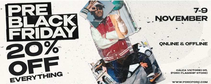 Porcporc.com dă startul reducerilor cu 20% la absolut tot, inclusiv la articolele deja reduse, în perioada 7-9 noiembrie, atât online cât și în flagship store-ul din București. Trebuie doar să folosești codul NOTBF20 la finalizarea comenzii. Ai, de exemplu, hanorace de la 275 lei sau jachete cool de la 312 lei. Grăbește-te, oferta e limitată! Detalii aici! 🔥🛍️👕