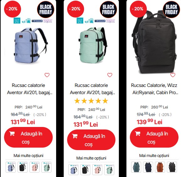 eBagaje are campanie Black Friday cu reduceri consistente la trolere, genți și rucsacuri de cabină aprobate Ryanair și Wizz Air. Rucsacul Aventor AV201 costă acum doar 115 lei (redus cu 30% din 240 lei), iar trolerul de cabină Aventor AV104 e 110 lei (cu 40% mai puțin față de PRP 280 lei). Grăbește-te, sunt stocuri limitate! Ofertele sunt disponibile aici!🎒✈️