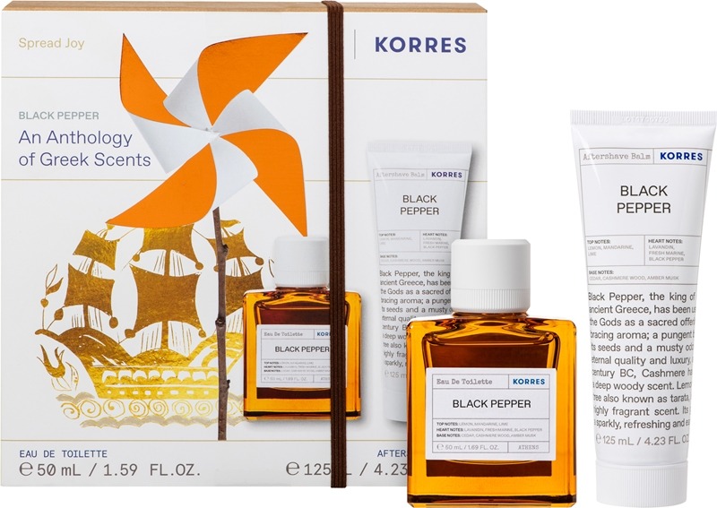 Setul Korres Black Pepper pentru bărbați, cu Eau de Toilette 50 ml și balsam aftershave 125 ml, e disponibil acum pe Notino la 118 lei, redus cu 20% față de prețul inițial de 147 lei, dacă aplici codul black. E un mix revigorant de citrice, piper și lemn, vegan și testat dermatologic. Ideal ca dar. 🧴🌿🎁