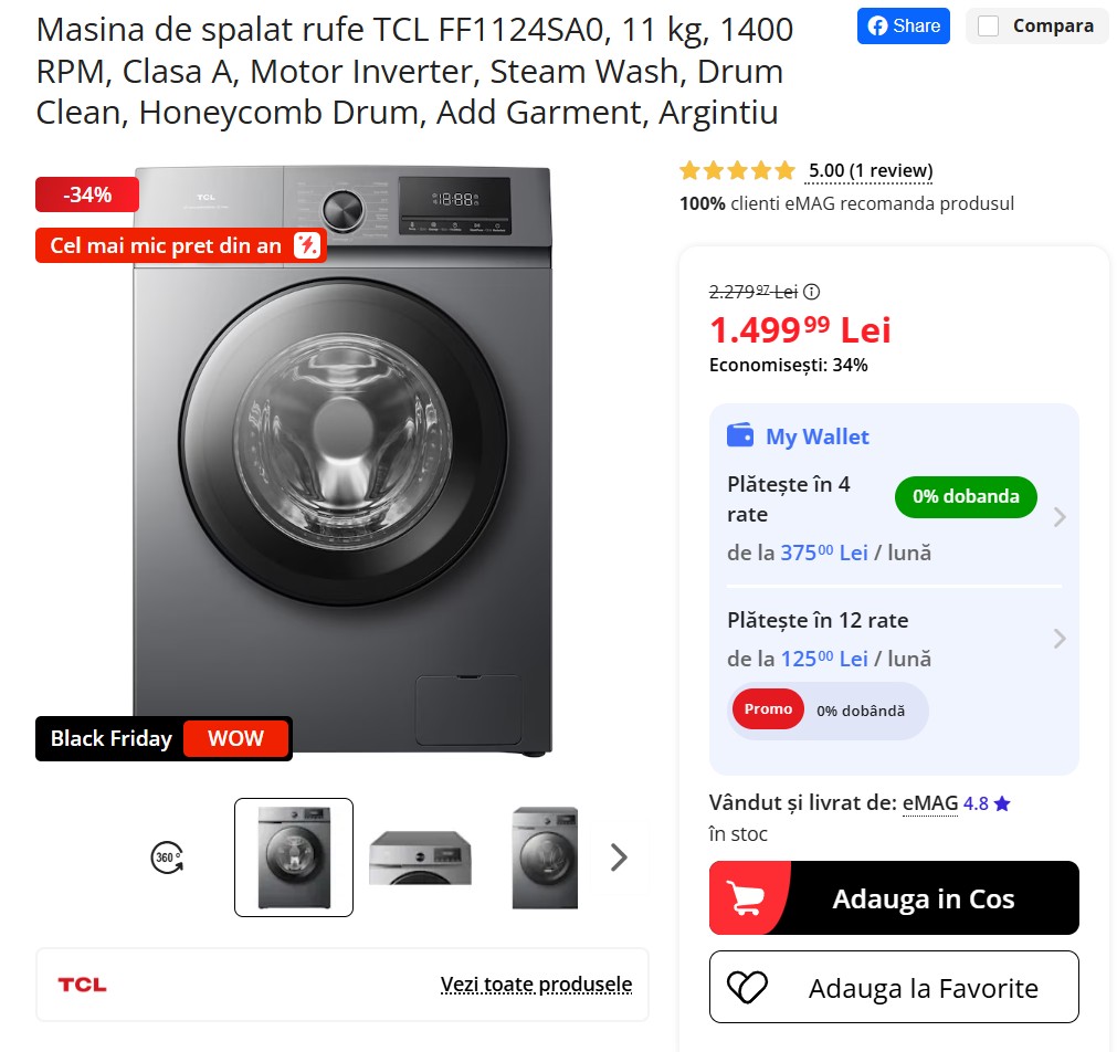 Mașina de spălat TCL FF1124SA0 cu o capacitate generoasă de 11 kg, motor inverter, 1400 RPM și funcții moderne precum abur, Add Garment și Drum Clean, are acum o reducere de 34% pe eMAG – prețul scade de la 2279 lei la doar 1499 lei. E cel mai mic preț din an, dar stocul e limitat, deci nu aștepta prea mult! Comanzi aici!🧼🌀🧺