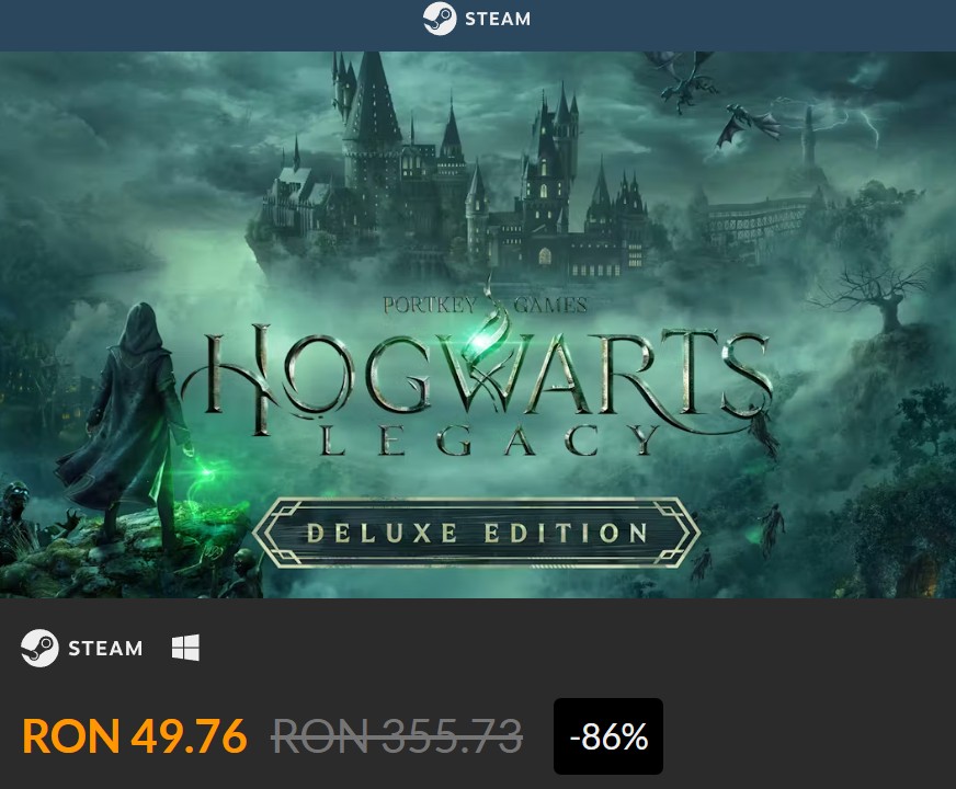 Ediția Deluxe a jocului Hogwarts Legacy pentru Steam e disponibilă acum pe Fanatical la doar 49,76 lei, cu 86% mai ieftin față de prețul inițial de 355,73 lei. Un RPG open-world așteptat de fani, cu acces la conținut extra față de versiunea standard. Prețul e excelent pentru un titlu de top, dar promoția poate expira rapid. 🎮🧙♂️🔥