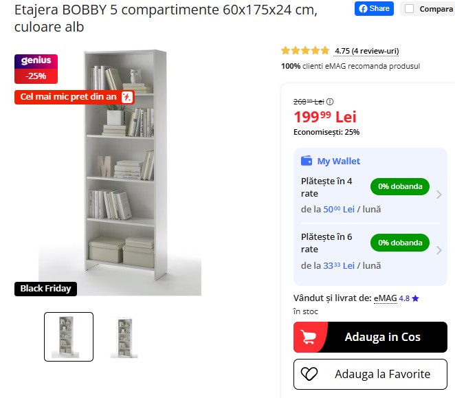 Etajera BOBBY cu 5 compartimente și design modern, ideală pentru living sau dormitor, are acum cel mai mic preț din an pe eMAG: 199,99 lei, redusă cu 25% față de 268,99 lei! Măsoară 60x175x24 cm, e realizată din PAL alb și se montează ușor – perfectă pentru depozitare elegantă. Stocul e limitat! 🧱📚🛒