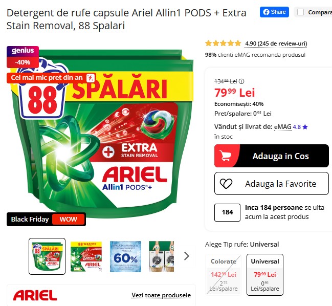 Capsulele Ariel Allin1 PODS + Extra Stain Removal, eficiente chiar și în apă rece, sunt acum 79,99 lei la eMAG, cu 40% mai ieftine față de prețul anterior de 134,99 lei – cel mai mic preț din an! Primești 88 de spălări, cu doar 0,91 lei per spălare, pentru curățare în profunzime și pete dificile. Stoc limitat! 🧼🧺🔥