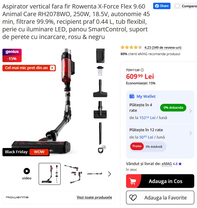 Aspiratorul vertical fără fir Rowenta X-Force Flex 9.60 Animal Care, cu tub flexibil, perie cu LED, autonomie de 45 min și filtrare 99,9%, are acum cel mai mic preț din an pe eMAG: 609,99 lei, redus cu 15% față de 724,87 lei! Ușor, versatil și ideal pentru părul de animale. Grăbește-te, stocul e limitat! 🧹🐾⚡