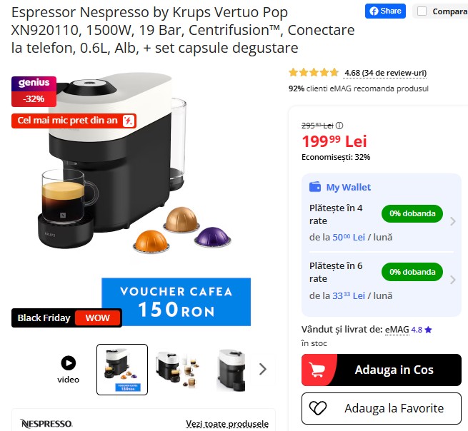 Espressorul Nespresso by Krups Vertuo Pop XN920110, cu 19 bar presiune, conectare la telefon și tehnologie Centrifusion, costă acum doar 199,99 lei la eMAG – cu 32% mai puțin față de prețul anterior de 295,80 lei. Vine cu set de capsule degustare și voucher cadou de până la 150 lei pentru cafea! Stocul e limitat. ☕📱🔥