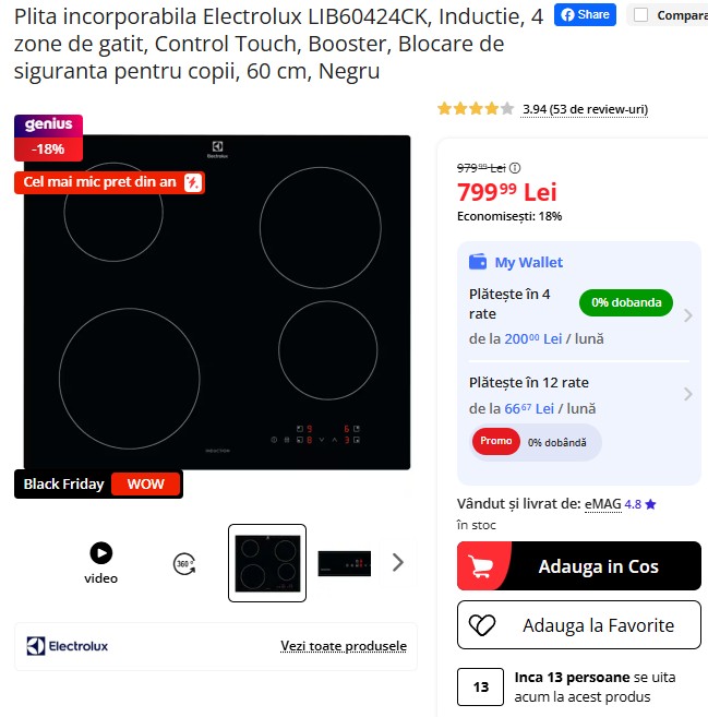 Plita incorporabilă cu inducție Electrolux LIB60424CK, cu 4 zone de gătit, funcție Booster și control touch, este disponibilă acum la 799,99 lei pe eMAG – cu 18% mai ieftină decât prețul anterior de 979,99 lei. Este cel mai mic preț din an, iar dacă o înregistrezi, primești 5 ani garanție! Simplă, sigură și modernă, e alegerea ideală pentru o bucătărie eficientă. Stoc limitat! ⚡🍳🖐️