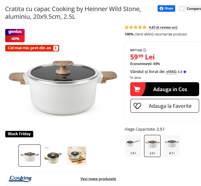 Cratița cu capac Cooking by Heinner Wild Stone, din aluminiu cu acoperire ceramică, 20 cm și 2,5L, este acum doar 59,99 lei la eMAG – cu 40% mai ieftină față de prețul inițial de 99,99 lei, cel mai mic preț din an! Compatibilă cu toate tipurile de plite, inclusiv inducție, și cu un design elegant, este perfectă pentru gătit zilnic. Stoc limitat! 🍲🔥🖤