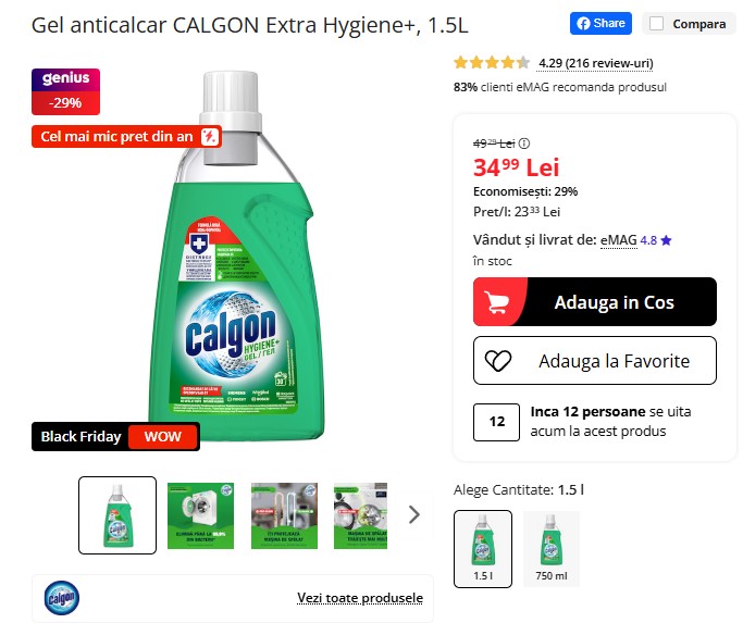 Gelul anticalcar CALGON Extra Hygiene+, 1.5L, este disponibil acum la 34,99 lei (redus cu 29% de la 49,29 lei) — cel mai mic preț din an! Oferă protecție completă împotriva calcarului, bacteriilor și mirosurilor neplăcute, acționează chiar și la 30°C și este compatibil cu toate tipurile de mașini de spălat. O sticlă ajunge pentru 30 de spălări. 🧼🦠💧 Grăbește-te, stocurile sunt limitate în campania Black Friday!