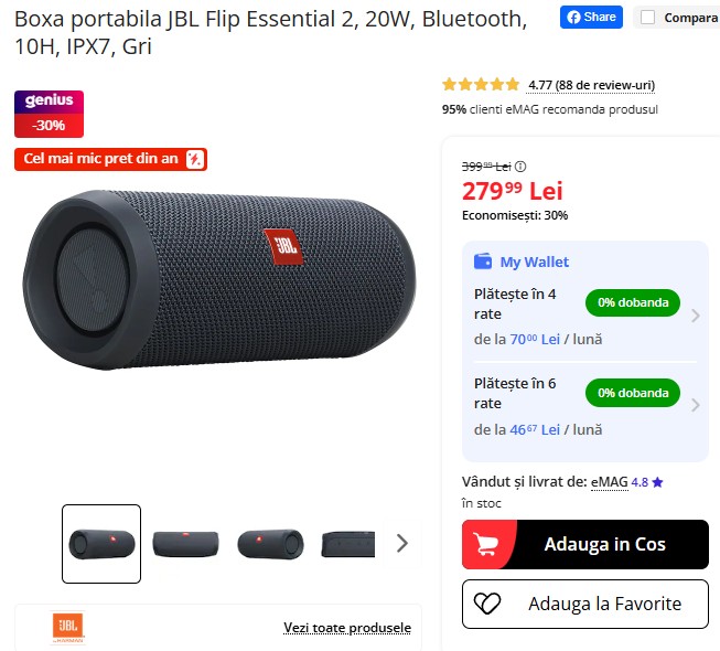Boxa portabilă JBL Flip Essential 2 oferă 20W, autonomie de 10 ore și rezistență la apă IPX7, fiind acum disponibilă pe eMAG la 279,99 lei, redusă cu 30% față de prețul anterior de 399,99 lei – cel mai mic preț din an. Sunet puternic, design compact, perfectă pentru ieșiri. Stocul e limitat, profită cât mai e valabilă oferta! 🔊💦⏳