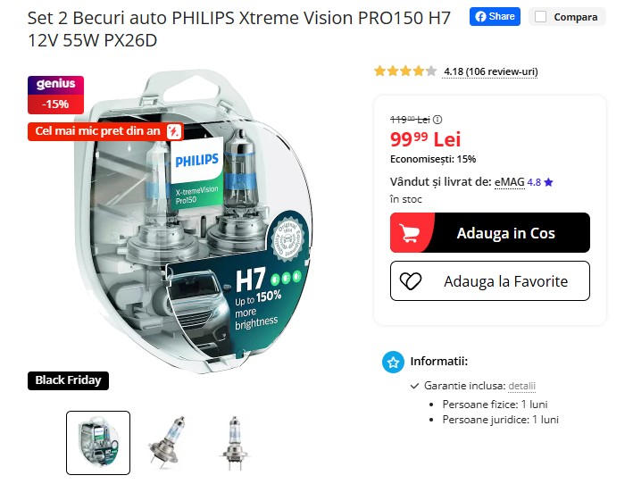 Setul de 2 becuri auto Philips Xtreme Vision PRO150 H7, cu lumină mai intensă cu până la 150% și durată de viață de până la 450 de ore, are acum cel mai mic preț din an pe eMAG: 99,99 lei, redus de la 119 lei (15% reducere). Vizibilitate sporită, siguranță mai bună în condus – merită dacă prinzi oferta! 💡🚗⚠️
