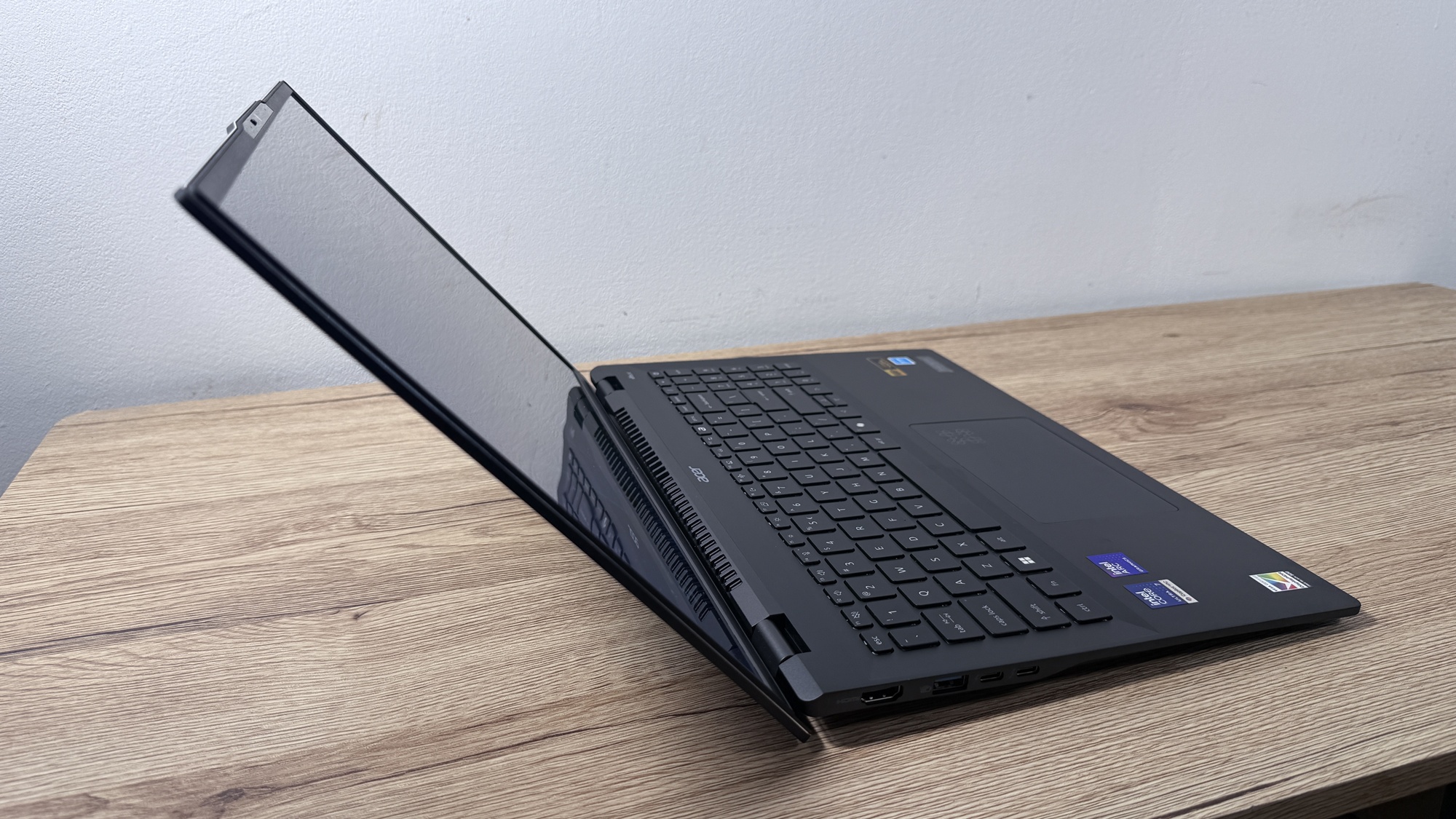 Balamaua este fermă și permite deschiderea cu un singur deget, un detaliu apreciat în utilizarea de zi cu zi. Odată deschis, laptopul ridică discret partea din spate a șasiului, ceea ce contribuie la o poziție de scris mai comodă și la o disipare termică mai eficientă.