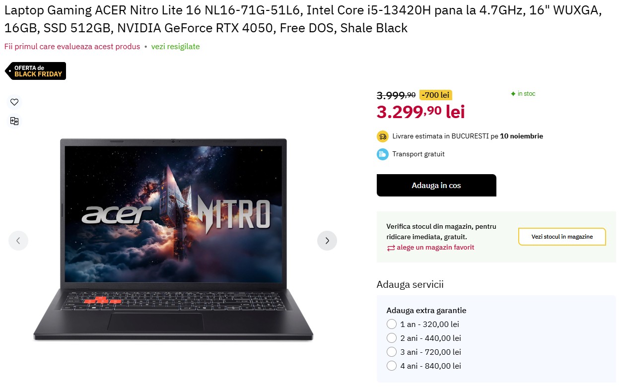 Laptop de gaming cu RTX 4050 la preț redus; Acer Nitro Lite 16 e în oferta Altex de Black Friday