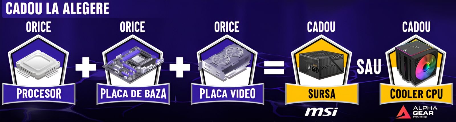 Cealaltă opțiune, mai flexibilă, este dedicată celor care își configurează singuri sistemul. Dacă adaugi în coș un procesor + placă de bază + placă video, indiferent de brand, iar valoarea totală ajunge la cel puțin 2.500 lei, primești cadou la alegere: o sursă MSI sau un cooler de procesor Alpha Gear. Oferta se aplică exclusiv comenzilor în care cele trei categorii sunt prezente și achiziționate împreună, într-o singură tranzacție.