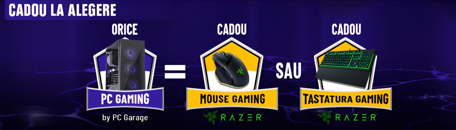 Pentru cei care aleg un sistem complet din gama PC Gaming by PC Garage, cadoul se oferă automat: poți alege între un mouse Razer pentru gaming sau o tastatură Razer, două periferice cu reputație bună în zona de esports și setup-uri personale. Sistemele respective sunt deja asamblate și testate de echipa magazinului, cu piese selectate pentru performanță în jocuri, deci potrivite pentru cine nu vrea să piardă timp cu selecția individuală de componente.