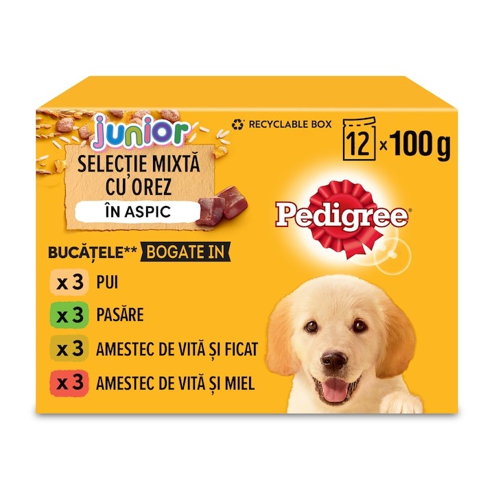 Hrana umedă Pedigree Junior, selecție de carne cu orez în aspic (12x100g), e perfectă pentru căței – conține ingrediente atent alese pentru susținerea digestiei, oaselor și imunității în primele luni de viață. Prețul este 36,99 lei la eMAG, dar cu codul petshop aplicat la comenzi de minimum 39 lei, ai 20% reducere, deci o iei cu doar 29 lei. Stocul e limitat! 🐶🥩🛒