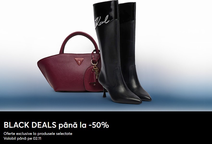 Campania Black Deals de pe epantofi.ro vine cu reduceri consistente de până la -50% la articole selecționate din categoriile de încălțăminte, genți și accesorii pentru femei, bărbați și copii. Promoția este valabilă până pe 2 noiembrie 2025, iar în plus, pe lângă reducerile afișate, se poate obține extra -20% dacă folosești un cod promoțional - BLACK20” disponibil în site, aplicabil la anumite produse.