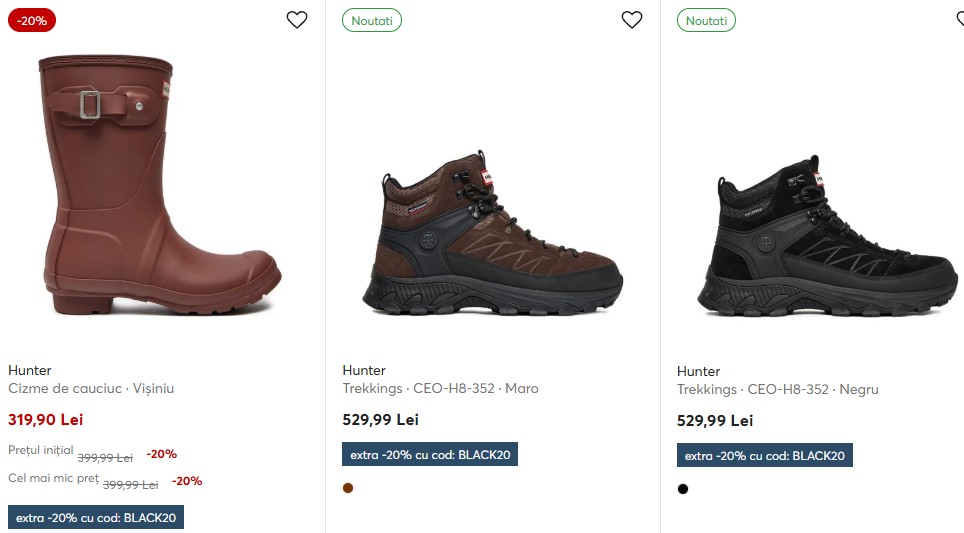 Codul promoțional pentru extra -20% este afișat pe pagina principală a promoției și poate fi aplicat doar la anumite articole selecționate din colecția nouă de încălțăminte, marcate cu eticheta „noutăți”. Reducerea este valabilă pentru comenzi de minimum 229 lei, iar unele dintre produsele eligibile sunt deja reduse, astfel că discountul de -20% se aplică suplimentar față de prețul promoțional, acolo unde este permis.
