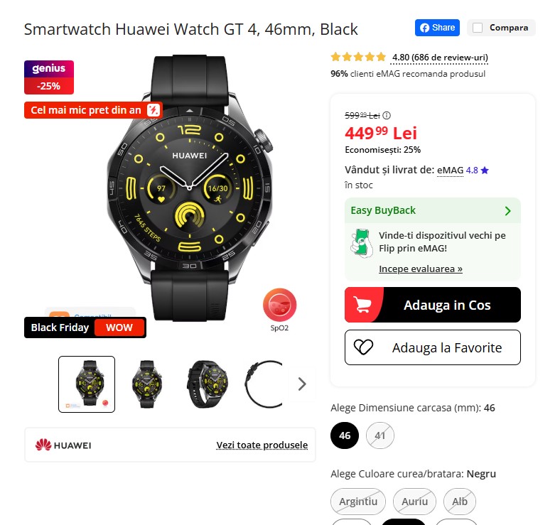 Huawei Watch GT 4, varianta de 46mm în culoarea neagră, este redus acum la 449 lei pe eMAG, cu 25% mai puțin față de prețul recomandat de 599 lei. Oferă autonomie de până la 14 zile, GPS precis, monitorizare avansată a somnului, stresului și ritmului cardiac, plus ecran AMOLED elegant. E cel mai mic preț din an. Îl găsești aici!⚫⌚🔥