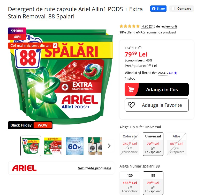 Detergentul Ariel Allin1 PODS Extra Stain Removal, 88 capsule, e redus acum la 79 lei pe eMAG, cu 40% sub prețul recomandat de 134 lei. Curăță eficient chiar și în apă rece și îndepărtează petele vechi de până la 7 zile. Cel mai mic preț din an și cost de doar 0,91 lei/spălare. Ofertă valabilă cât timp mai e stoc. Comanzi aici! 🧼👕📦