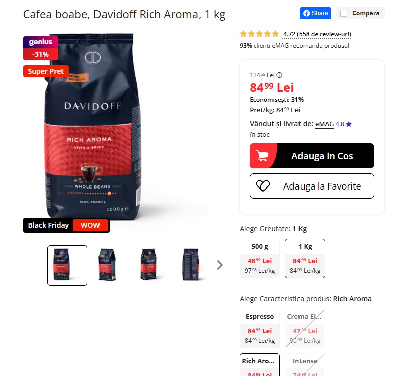 Cafeaua boabe Davidoff Rich Aroma, 1 kg, are acum un preț redus la 84 lei pe eMAG, cu 31% mai puțin decât prețul recomandat de 124 lei. Amestec intens, cu note ușor acide și aromă echilibrată, ideală pentru espresso. E cel mai mic preț din campania actuală Black Friday și include livrare rapidă. Comanzi aici!☕📦🔥