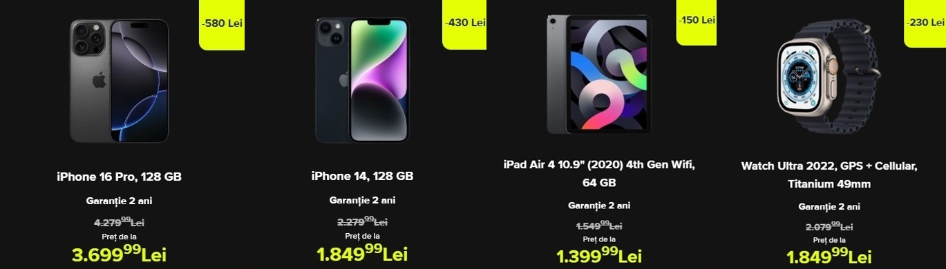 Reducerile anunțate ajung până la 1000 de lei, iar lista de produse acoperă majoritatea categoriilor tech – de la telefoane și tablete, până la ceasuri smart, laptopuri și console. Dispozitivele au fost testate în detaliu (până la 67 de verificări hardware și software), iar returul este gratuit în termen de 30 de zile.