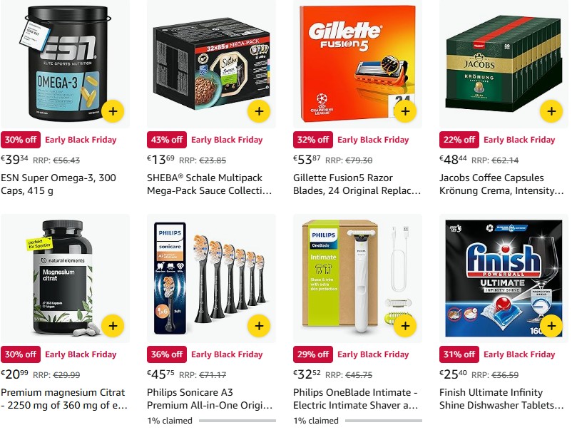 Pe Amazon Germania, Early Black Friday e în plină desfășurare, cu până la -50% reducere la produse din îngrijire personală, suplimente, băuturi, cafea sau gadgeturi. Transportul e gratuit la comenzi de peste 49 €. Las aici un tutorial pentru cum poți da și tu o comandă.