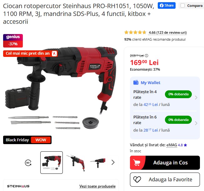 Ciocanul rotopercutor Steinhaus PRO-RH1051 de 1050W, cu 4 funcții, energie de impact de 3J și mandrină SDS-Plus, este acum redus pe eMAG de la 269,99 lei la doar 169 lei – adică cu 37% mai puțin, fiind și cel mai mic preț din an. Vine cu kitbox și accesorii incluse, perfect pentru lucrări casnice. Stocul e limitat! 🔧⚡📦