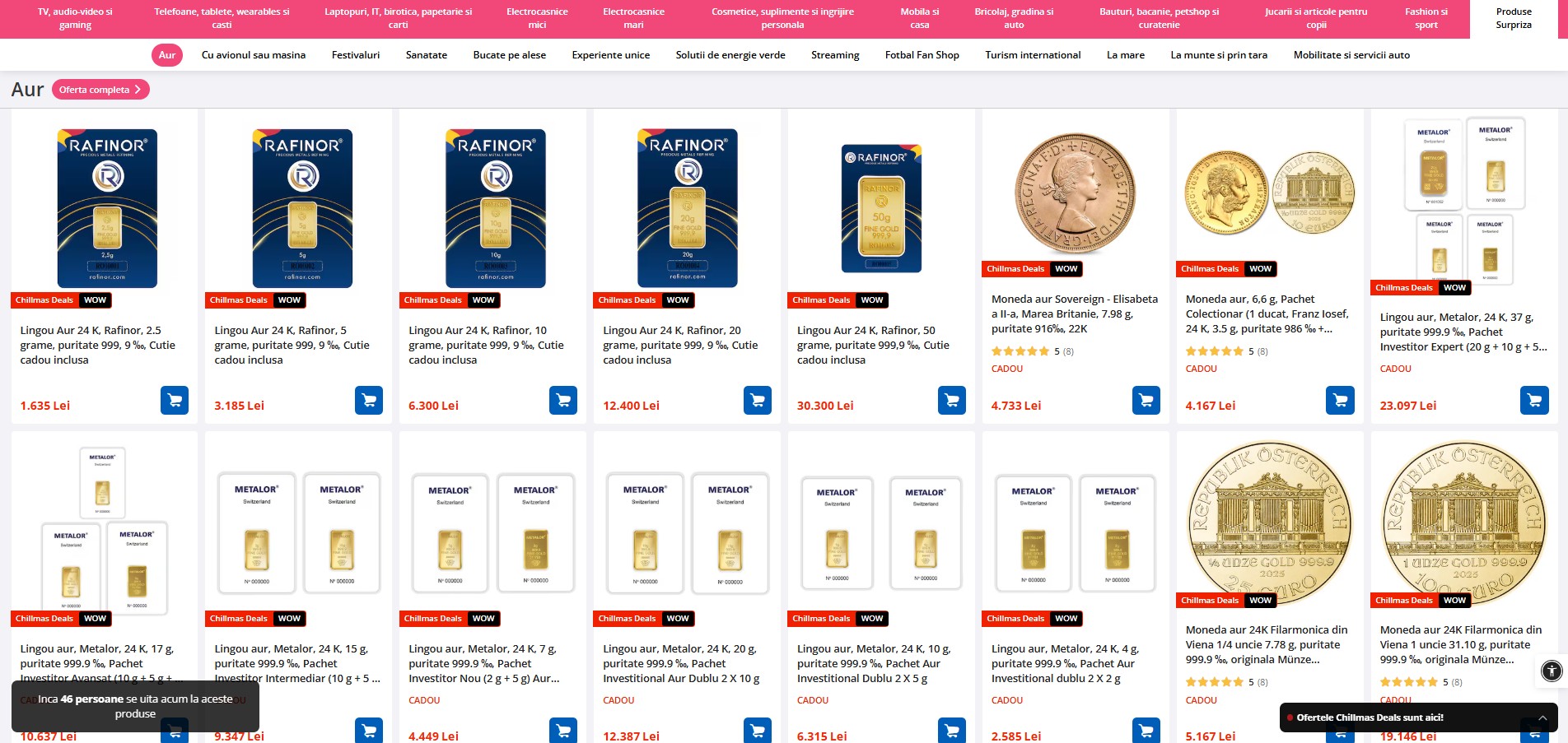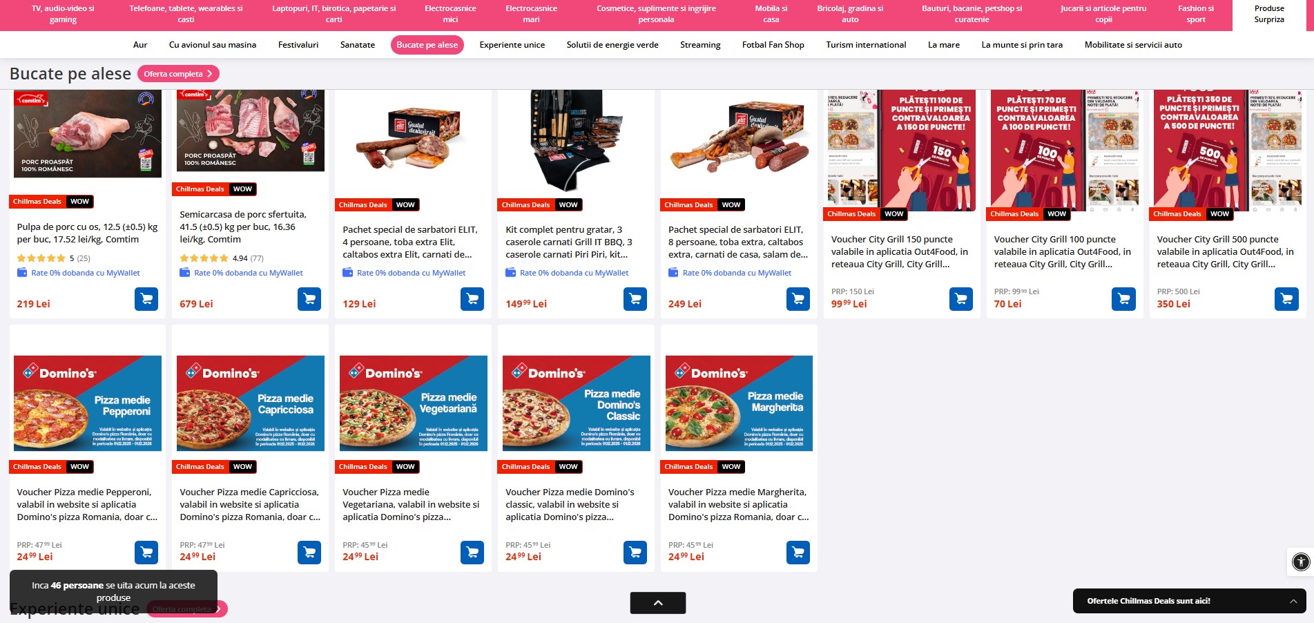 Rămân în portofoliul cu reduceri și produsele surpriză, de la lingouri de aur, abonamente la servicii de streaming, bilete la festivaluri sau chiar carne de porc. În paralel, continuă oferta care ne aduce 50 lei discount pentru prima comandă în aplicația eMAG, iar achizițiile se pot face în 6 rate fără dobândă.