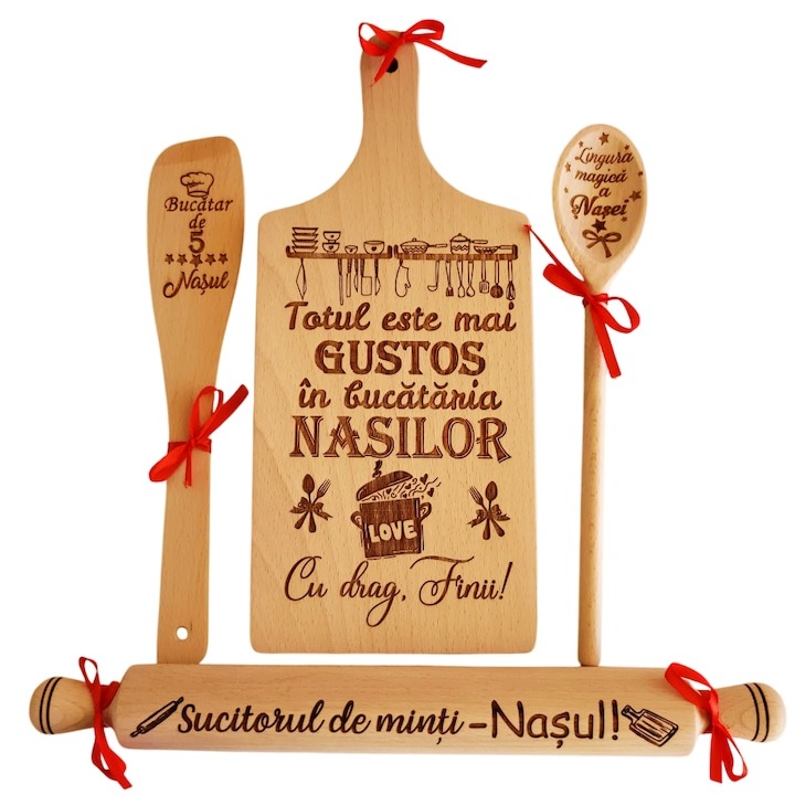 Setul de bucătărie din lemn cu gravură laser, ideal ca și cadou personalizat pentru nași, e acum redus la eMAG de la 99,64 lei la 84,69 lei – adică mai ieftin cu 15%. E produs 100% în România și vine cu un tocător de 36x16 cm și alte accesorii utile. Oferta e valabilă cât timp produsul e în stoc, așa că nu amâna! 🪵🎁🍽️