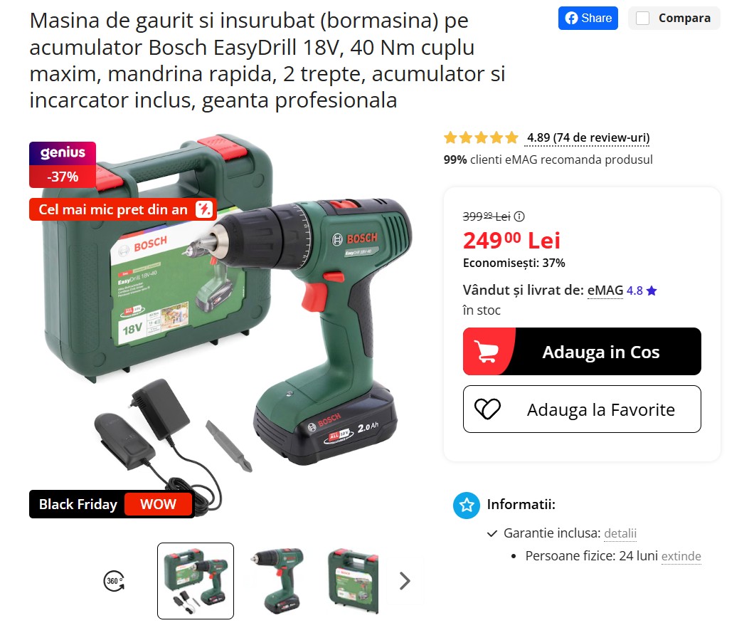 Bosch EasyDrill 18V, bormașina pe acumulator cu cuplu de 40 Nm, mandrină rapidă și 2 trepte, este disponibilă acum la eMAG cu doar 249 lei, redusă cu 37% față de prețul inițial de 399 lei. Vine cu geantă, încărcător și acumulator incluse și are 3 ani garanție prin înregistrare. Preț minim din an, valabil în Black Friday! Comanzi aici! 🔧🔋💼