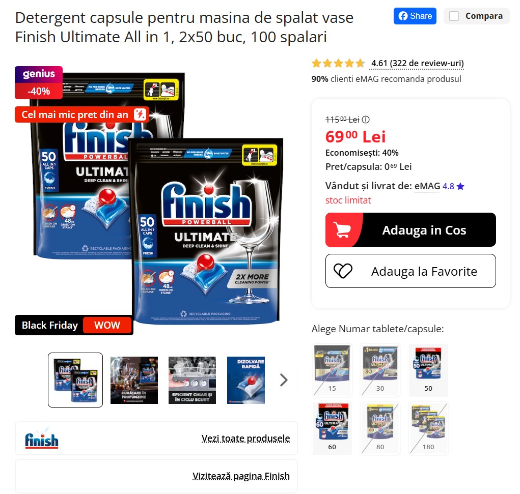 Setul Finish Ultimate All in 1 cu 100 de capsule pentru mașina de spălat vase este acum 69 lei la eMAG, cu 40% mai ieftin față de prețul inițial de 115 lei. Prețul pe capsulă e de doar 0,69 lei, iar produsul promite curățare profundă fără pre-clătire. Este cel mai mic preț din an, în campania Black Friday. Plasezi comanda aici! 🧼🍽️🔥