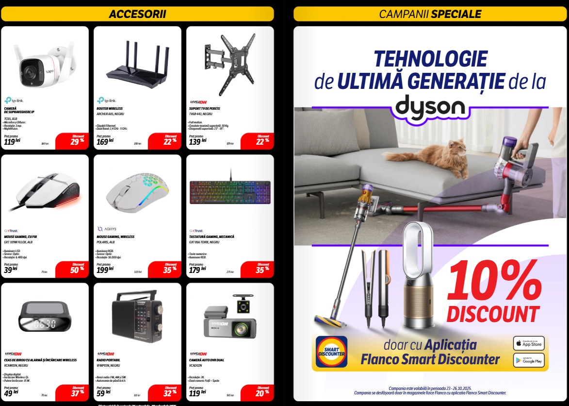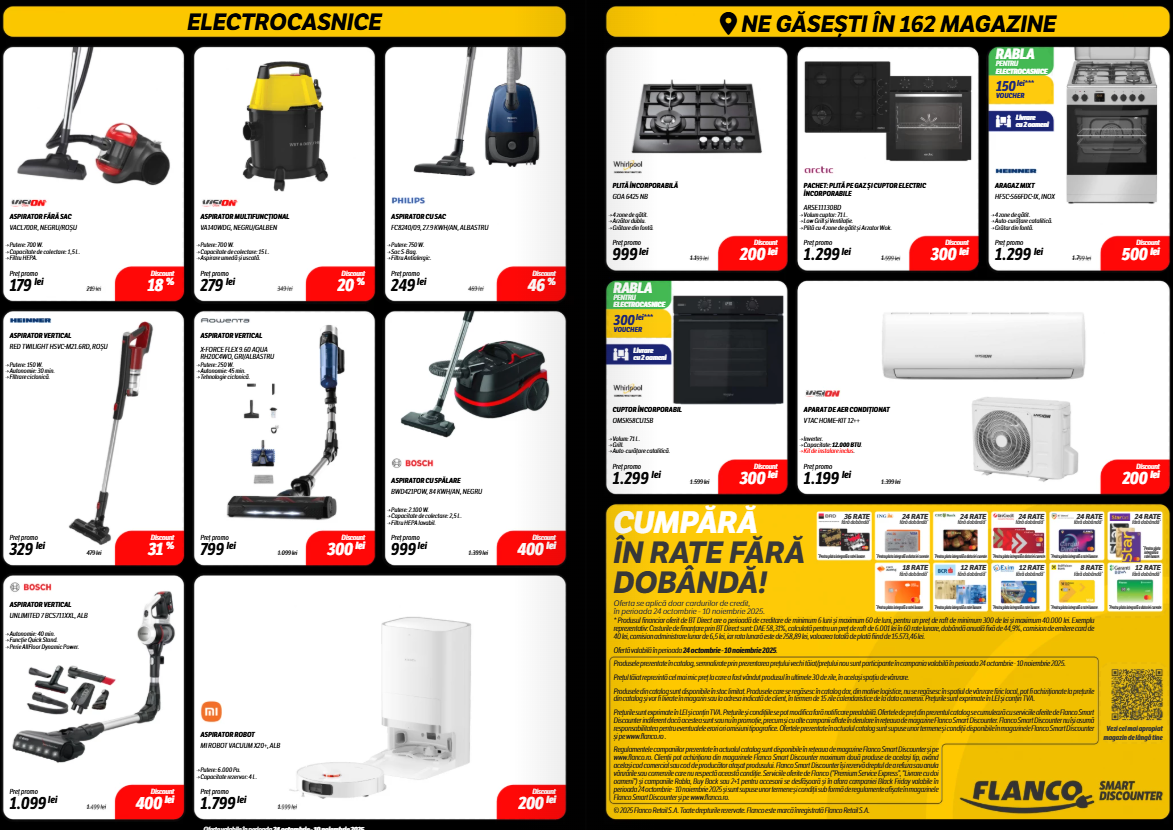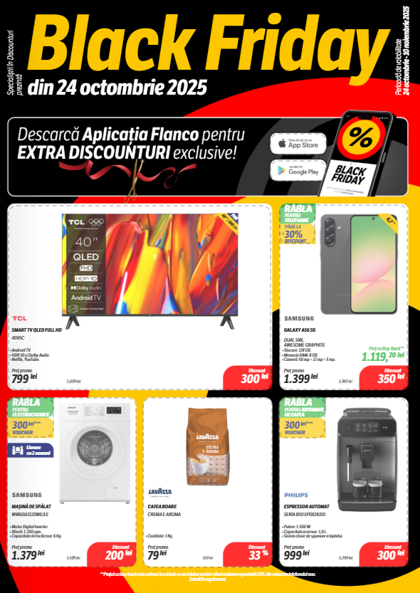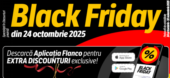 A început Black Friday la Flanco, cu reduceri active în perioada 24 octombrie – 30 noiembrie 2025, atât online, cât și în magazinele fizice. În paralel rulează și campanii speciale valabile exclusiv prin Aplicația Flanco Smart Discounter, cu extra discounturi și cupoane active pentru o parte din produse.