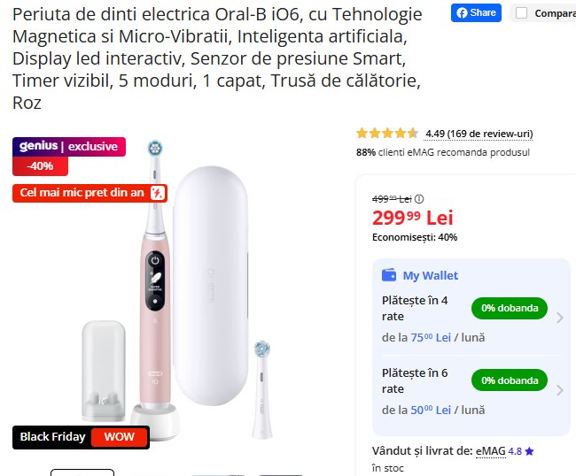 Periuța electrică Oral-B iO6, cu tehnologie magnetică, micro-vibrații, inteligență artificială și display LED, costă acum 299,99 lei pe eMAG, redusă cu 40% de la 499,99 lei – cel mai mic preț din an. Oferă 5 moduri de periaj, senzor de presiune și vine cu trusă de călătorie inclusă. Stocurile pot fi limitate! 🦷✨⚡