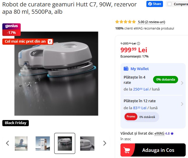 Robotul de curățare geamuri Hutt C7, cu 90W putere, rezervor de apă de 80 ml și aspirație de 5500Pa, e acum redus cu 17% pe eMAG, ajungând la 999,99 lei (de la 1.205,90 lei) – cel mai mic preț din an. Curăță eficient, se adaptează automat la murdărie și are autonomie de 20 minute. Stocurile sunt limitate! 🪟🤖💧